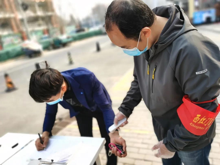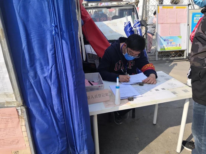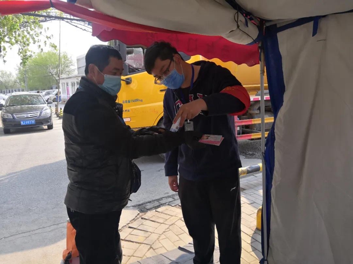 還有一件事我很驕傲。在工作中,我發(fā)現(xiàn)工作人員檢查證件時全都集中在卡口前,再加上村口人員嘈雜,使檢查工作既降低了效率,又容易造成人員聚集,于是我提議,檢查證件和測量體溫這兩項工作分別由兩位同事進行,在卡口處檢查證件,進入帳篷后由另一位同事對村民們進行體溫測量,這樣做提高了人員通過效率,也避免了村口人員聚集。