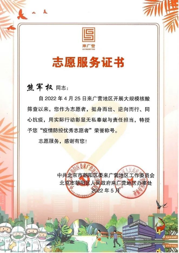 我真心地感謝北京化工集團、華騰東光公司領導給予了我這樣一次難得的、意義深遠的志愿服務機會,公司黨總支、工會還給我送來了慰問和溫暖。如果再有這樣的機會,我依然會積極去服務,盡自己的努力為身邊的人做一些力所能及的事。我志愿,我快樂,請組織放心,請領導放心,為了北京的平安,為了社區的平安,作為國企職工,我一定堅持到底,戰斗到底,直到北京全面清零,共創我們的美好家園。